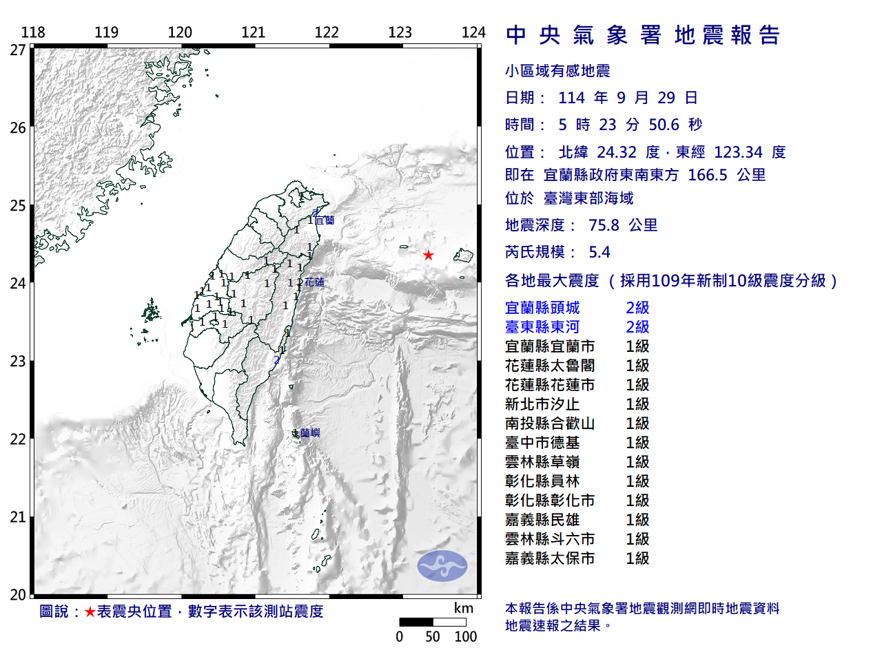 即在宜蘭縣政府東南東方 166.5 公里 (位於臺灣東部海域)